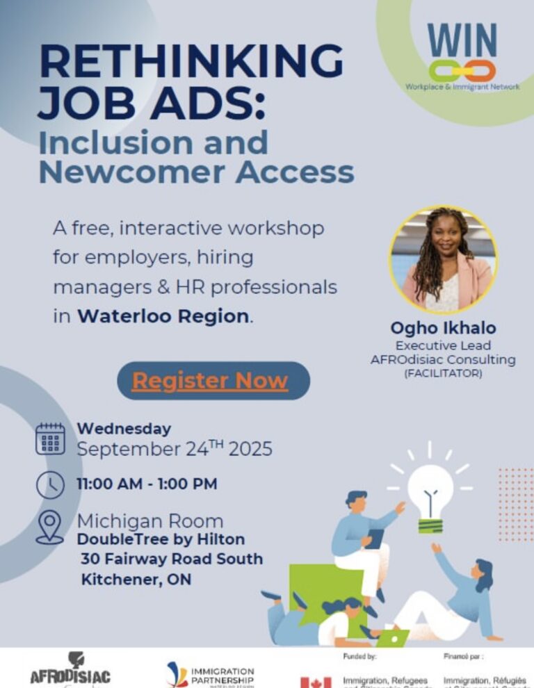 Join Immigration Waterloo Region, as they partner with Workplace & Immigration Network (WIN) and AFROdisiac Consulting to host a free interactive workshop for employers, hiring managers and HR professionals eager to improve their job posting to attract a wider, more qualified talent pool, including newcomers to Waterloo Region.